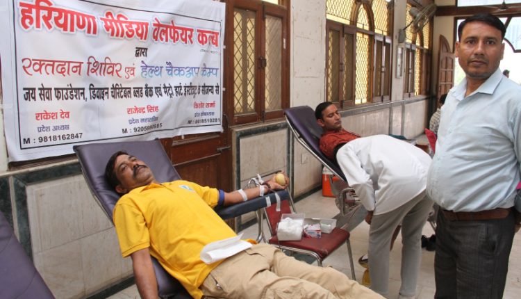 रक्तदान शिविर का आयोजन समाजसेवी विमल खंडेलवाल के नेतृत्व में जय सेवा फाउंडेशन व डिवाइन चैरिटेबल ब्लड बैंक के सौजन्य से किया गया। शिविर में 48 यूनिट रक्त एकत्रित किया गया, जिसमें पुलिस प्रशासन के आला अधिकारियों ने भी बढ़-चढक़र हिस्सा लिया। कार्यक्रम में मुख्य अतिथि के रूप में पहुंचे पुलिस उपायुक्त एनआईटी नरेन्द्र कादियान ने क्लब के पदाधिकारियों का हौसला बढ़ाया और कहा कि पत्रकारों की संस्था द्वारा उठाया गया इस प्रकार का कदम सराहनीय है और इसकी जितनी तारीफ की जाए कम है। उन्होंने इस शिविर में रक्तदान करने वाले पुलिस के इंसपेक्टर, सब इंस्पेक्टर एवं सिपाहियों की हौसलाफजाई की और कहा कि ऐसे पुलिस के जवानों को सम्मानित किया जाएगा, जिन्होंने आज यहां रक्तदान किया है।