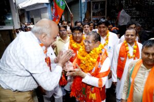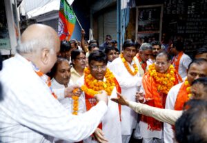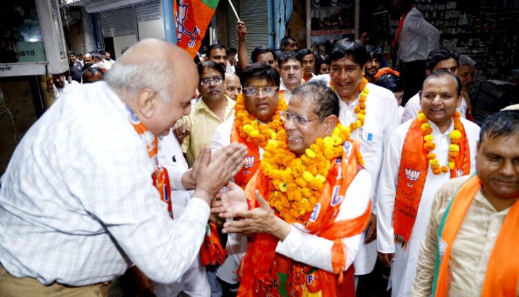 भाजपा प्रत्याशी राजेश नागर के साथ पूर्व मंत्री विपुल गोयल ने तिगांव मुख्य बाजार में किया डोर टू डोर कैंपेन