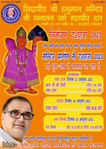 फरीदाबाद: ( नितिन कस्तूरिया) 21 अक्टूबर, सिद्धपीठ श्री हनुमान मंदिर 1 नंबर मार्किट में हर वर्ष की भांति इस बार भी दशहरा पर्व धूमधाम से मनाया जाएगा।