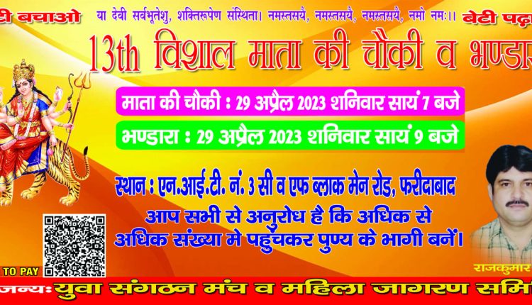 फरीदाबाद: 15 मार्च, युवा संगठन मंच एवं महिला जागरण समिति द्वारा माता की चौकी का आयोजन 29 अप्रैल शनिवार शाम को किया जा रहा है जिसमे एनसीआर की मशहूर पार्टी सुनील एंड पार्टी द्वारा महामाई का गुणगान किया जाएगा1